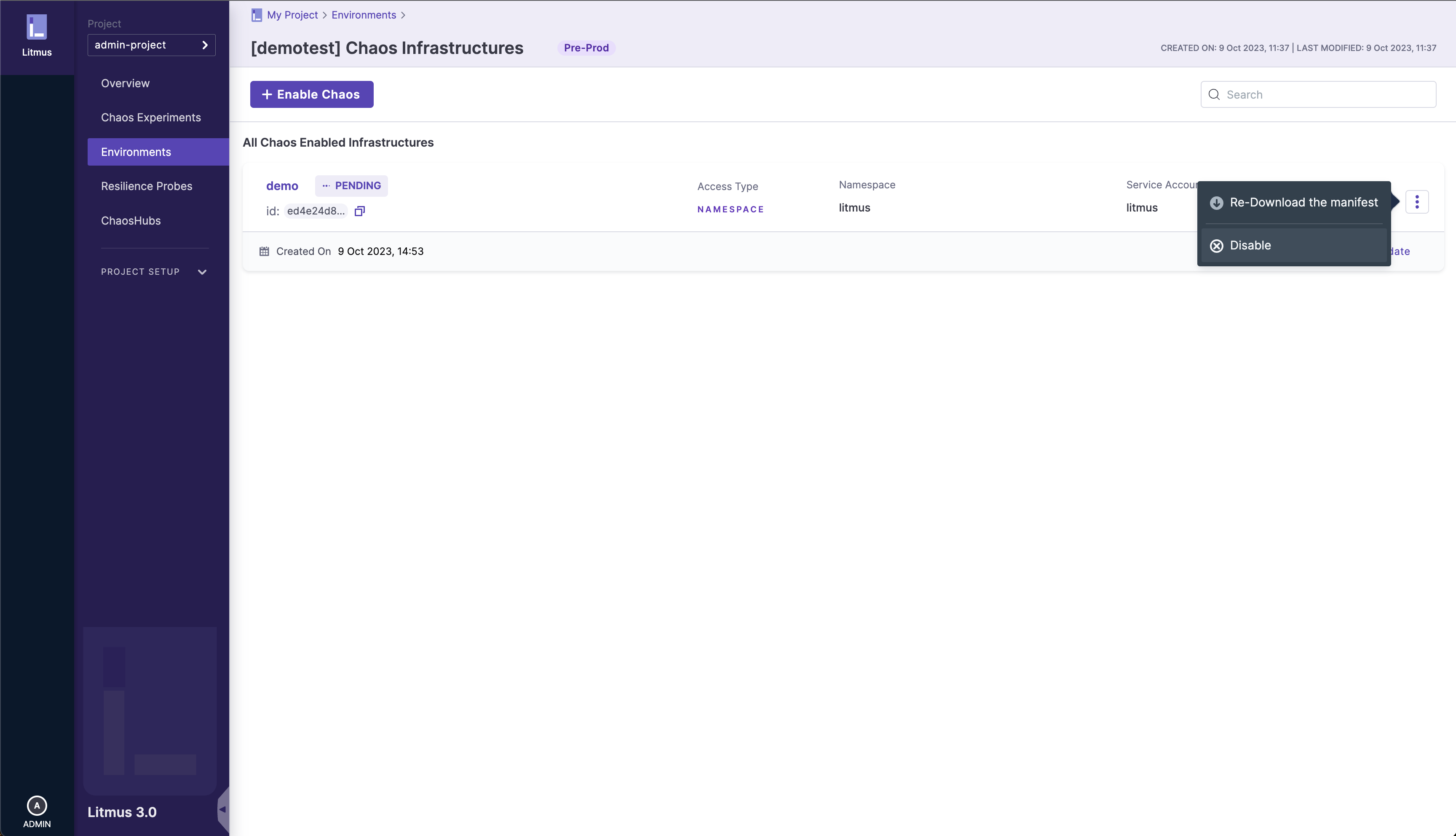 Navigate to the infrastructure you want to delete, and click on the â‹® icon to open the options menu and select Disable option: